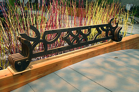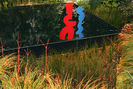 One of my favorites (I know, I know, I said I couldn't choose a favorite), "A Bridged View" by Dinsdale Landscape, is a mostly native garden with reflecting pond. Two squares are juxtaposed at a 45 degree angle. The larger square is hidden in the ground, filled with rock that acts as a natural filter for the 18-inch deep, reflecting pool and planted with spike rush (Eleocharis palustris). The colorful sculpture by Mel Kats and western red cedar hedge reflects in the pool. Although not my taste in sculpture, I know others who would find the startling contrast rather enjoyable. On the other side of the viewing bridge is another sculpture, more to my liking, by the same artist and planted with native red and yellow twig dogwoods.