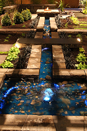 Matt Sander designed this space to be an outdoor room you can enjoy for three seasons. He likens the design to the "Old Portland comfortable, West Hills look." Who wouldn't be enticed to sit in the plush furniture next to a stone fireplace, under an inviting pergola? Surrounding the pergola are waterfalls and lush plantings in the containers and garden.