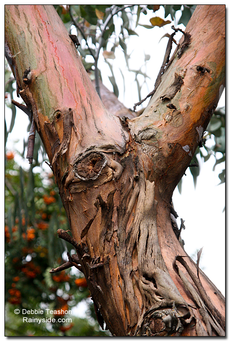 Another gum tree (Eucalyptus pauciflora ssp debeuzevillei) is an Australian native wearing a more conservative gray-to-green suit. The intriguing bark peels in large blotches, making the trunk look like it’s missing some jigsaw puzzle pieces, with a two-tone textural effect on the trunk and major branches.