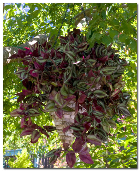 A few years ago, I hung a basket of ornamental oregano—Origanum 'Barbara Tingey'—from an open-branched plum tree that let in a lot of light. Since then, the plum tree has grown denser with shade, so hanging more shade tolerant plants is warranted.