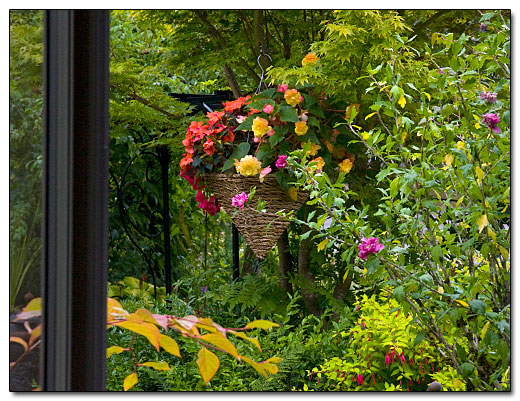 There are other upsides to hanging planters in the trees, such as no mess from a fuchsia basket dropping constant flower litter on the deck. By hanging mine in the boughs of a coral bark maple, under-planted with sarcococca and ferns I took care of the litter problem. The spent flowers fall off onto the foliage below. Any debris that remains visible is easily dealt with by tousling the understory leaves with one hand, while watering the container with the other. The debris falls to the ground, hidden from view, where it eventually decomposes, and adds humus to the soil.